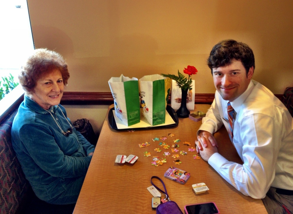…. but she thinks I am. Meet Lydia. She is one of our faithful guests at the Chick-fil-A of Wesley Chapel. Her friend, Brenda, brings her to eat lunch, talk, and work on jigsaw puzzles. The first time I met Lydia, she referred to me as “Mr. GQ”. I couldn’t help but laugh. I was tired, and dressed head to toe in Oobe work apparel. Dashing? Not in the least. But we had a blast that day. I’ve gotten to know her over the past few months… and always try to stop by her table to say hello. Her puzzle of choice today? Dora the Explorer. So as I sat for a few moments helping her with the puzzle, I couldn’t help but smile. You see… Lydia has Alzheimer’s… and it’s pretty advanced. She’s a special lady, and I’m so thankful God has given us the opportunity to be a bright spot in her day. As for “Mr. GQ”… I’ll own it for you, Ms. Lydia!